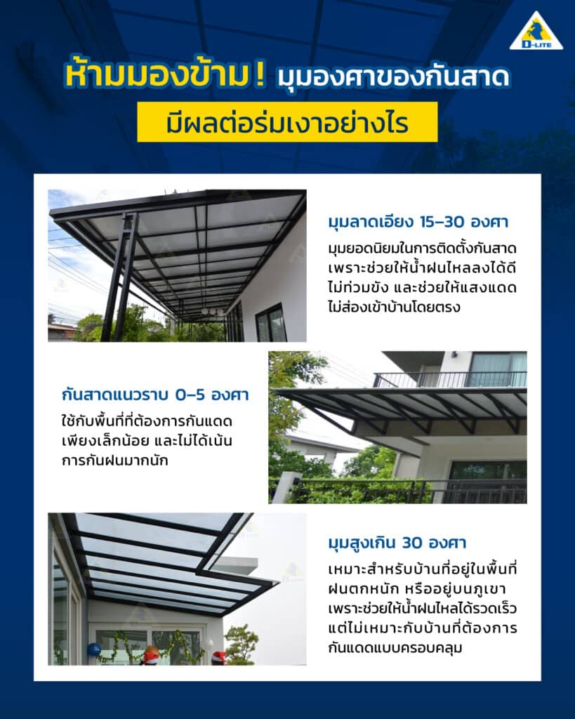 แม้จะเลือกทิศทางติดตั้งหลังคาได้ดีแล้ว แต่มุมหรือองศาของกันสาดเอง เป็นอีกปัจจัยที่มีผลอย่างมากต่อการสร้างร่มเงาให้เกิดขึ้นอย่างมีประสิทธิภาพ หากมุมไม่เหมาะสม อาจทำให้ร่มเงาที่ได้ไม่ครอบคลุมพื้นที่ หรือกันฝนไม่ได้เต็มที่ โดยองศาที่เหมาะสมของหลังคา มีดังนี้